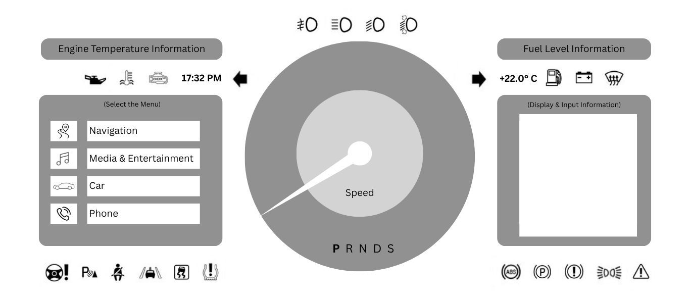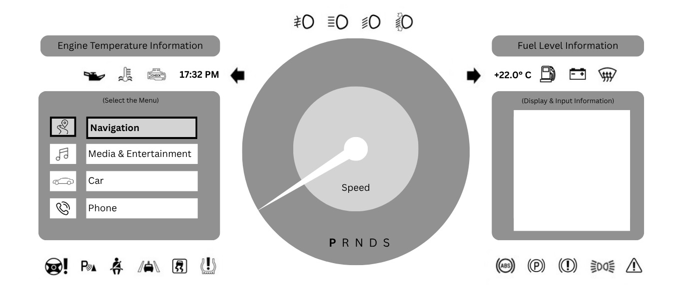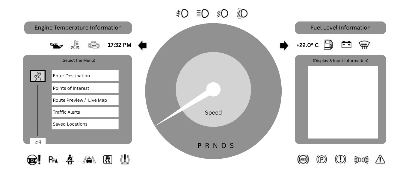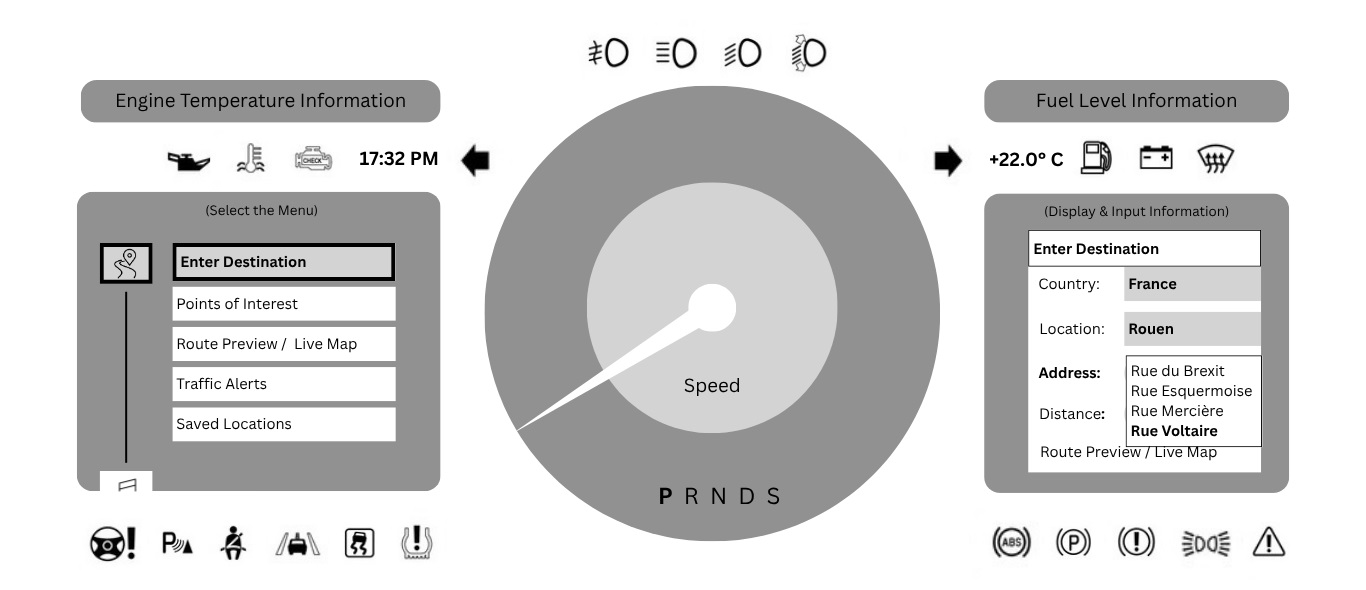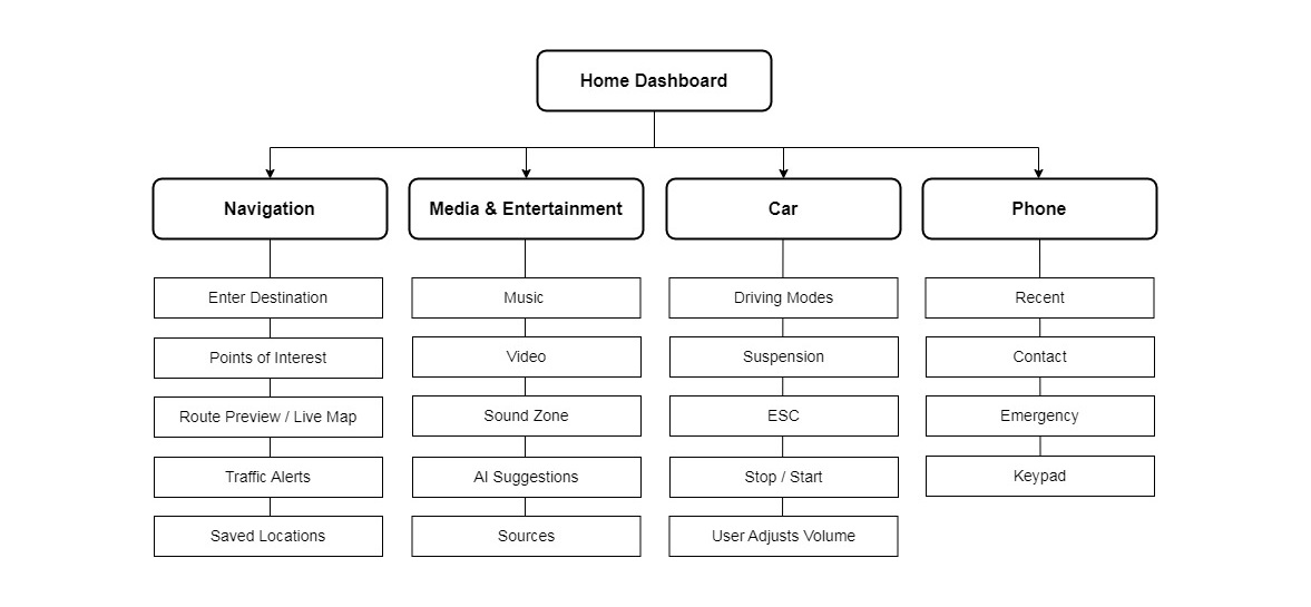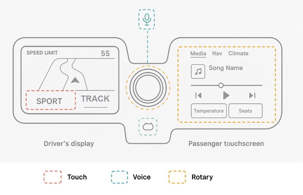 From rotary dial navigation to passenger touch interactions and contextual voice commands, each scenario is carefully mapped to prioritize clarity, feedback, and minimal distraction.