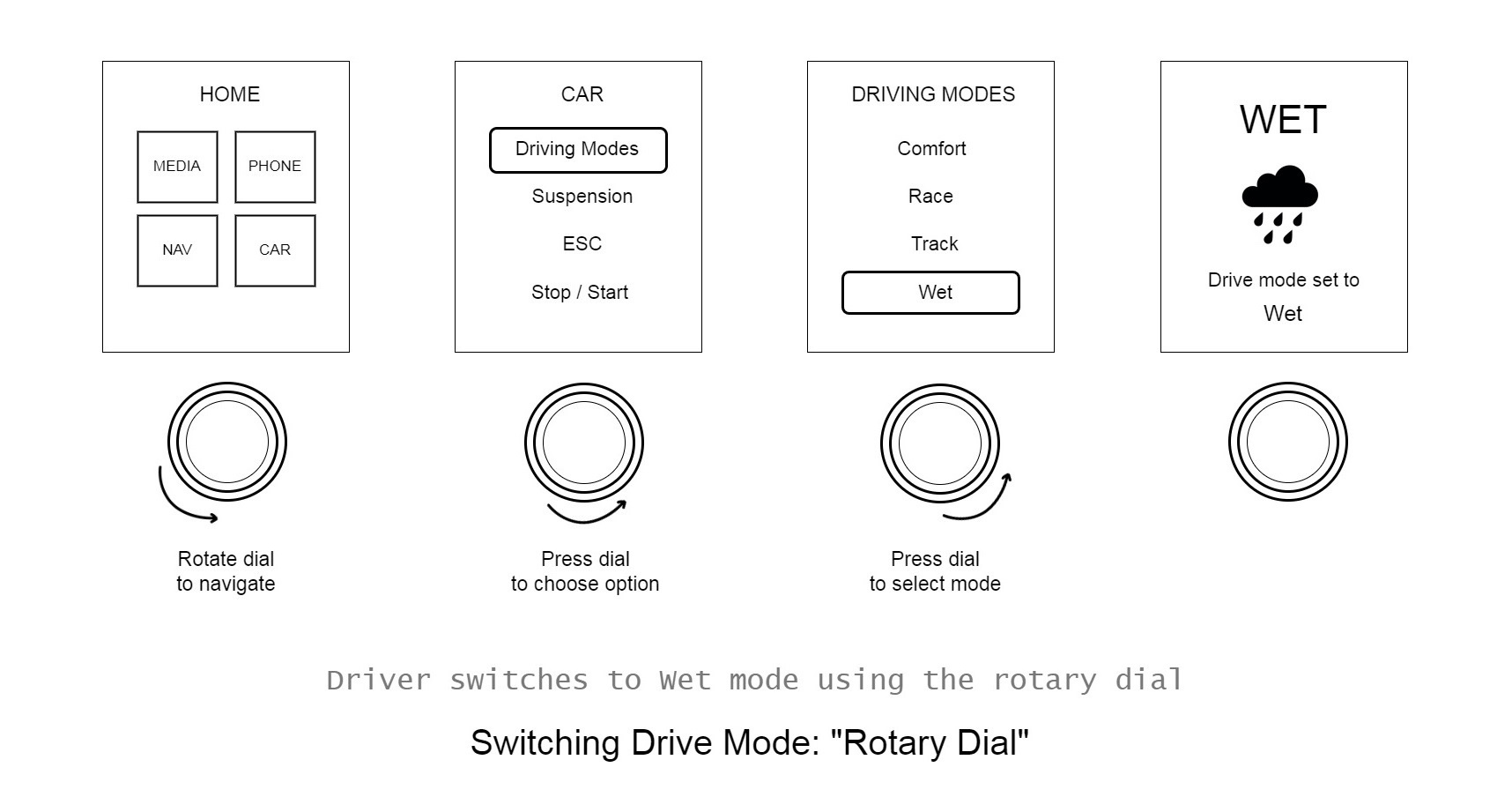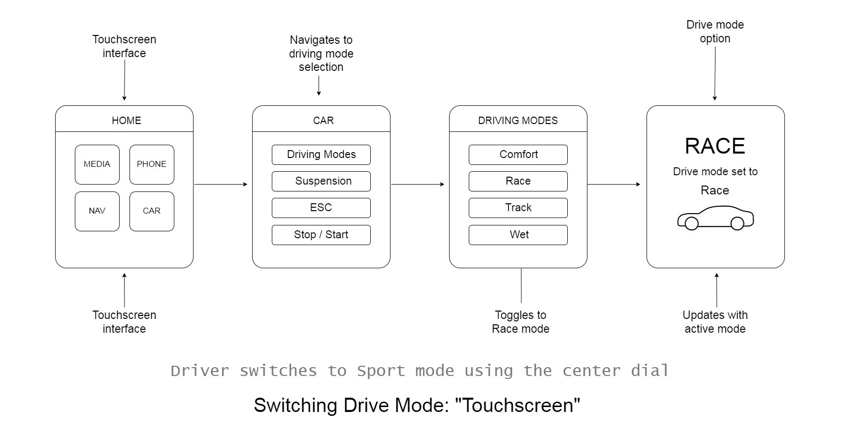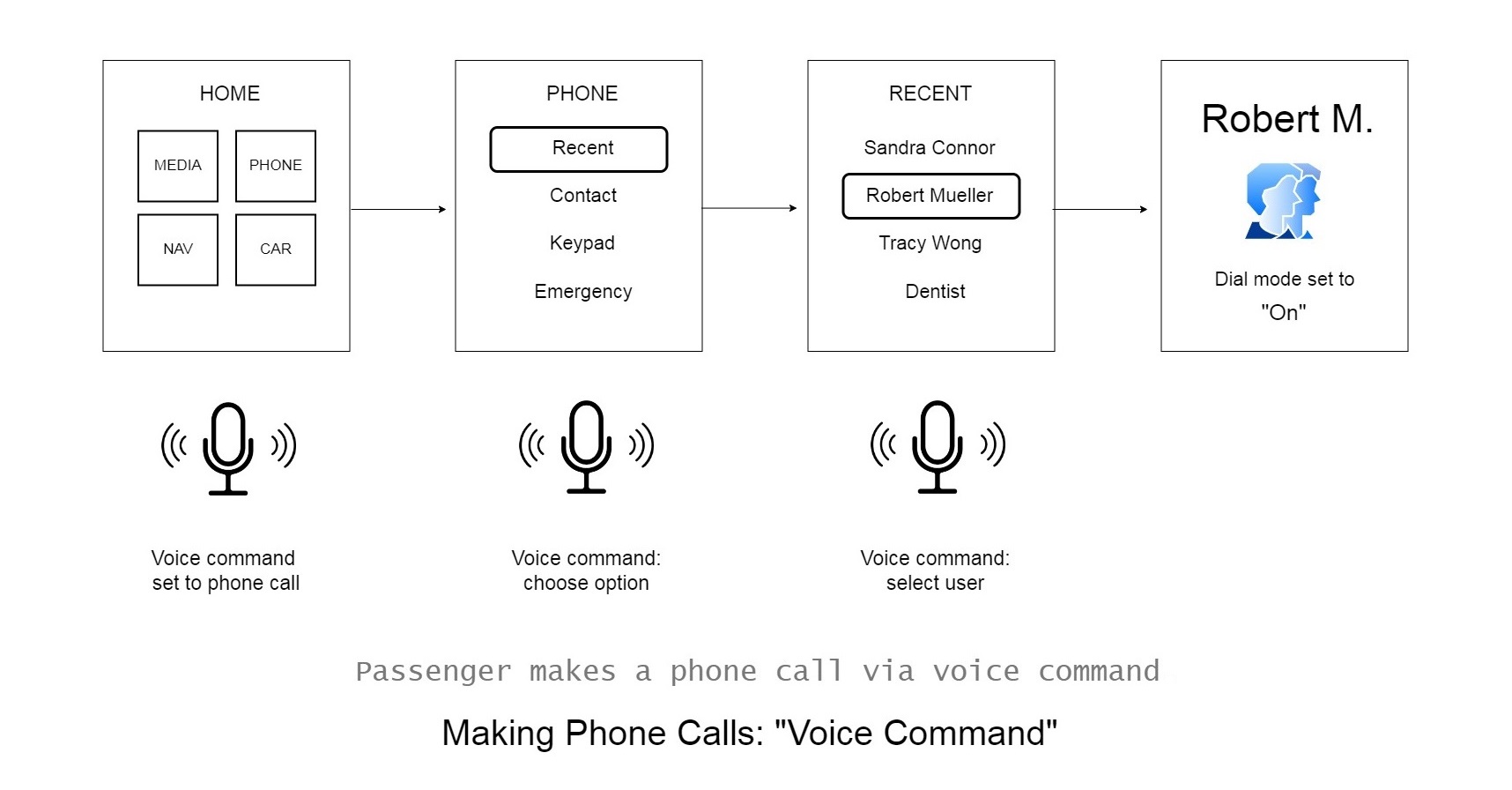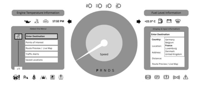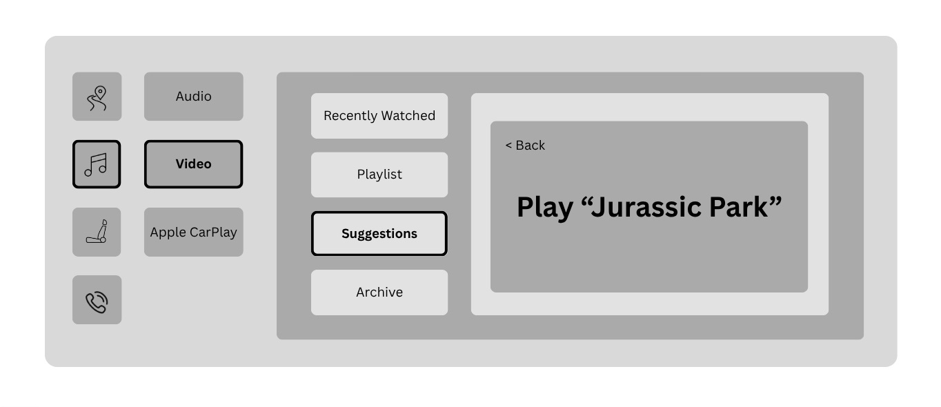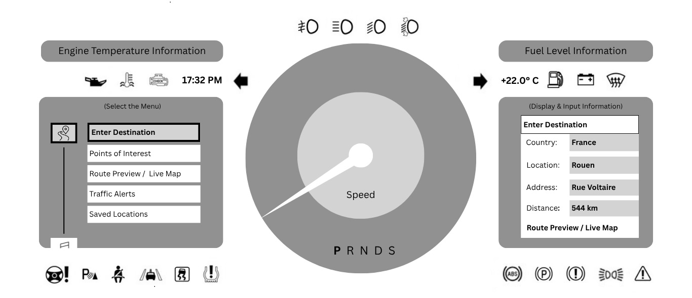 From rotary dial navigation to passenger touch interactions and contextual voice commands, each scenario is carefully mapped to prioritize clarity, feedback, and minimal distraction.