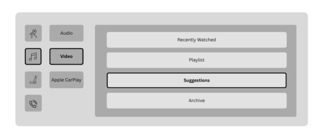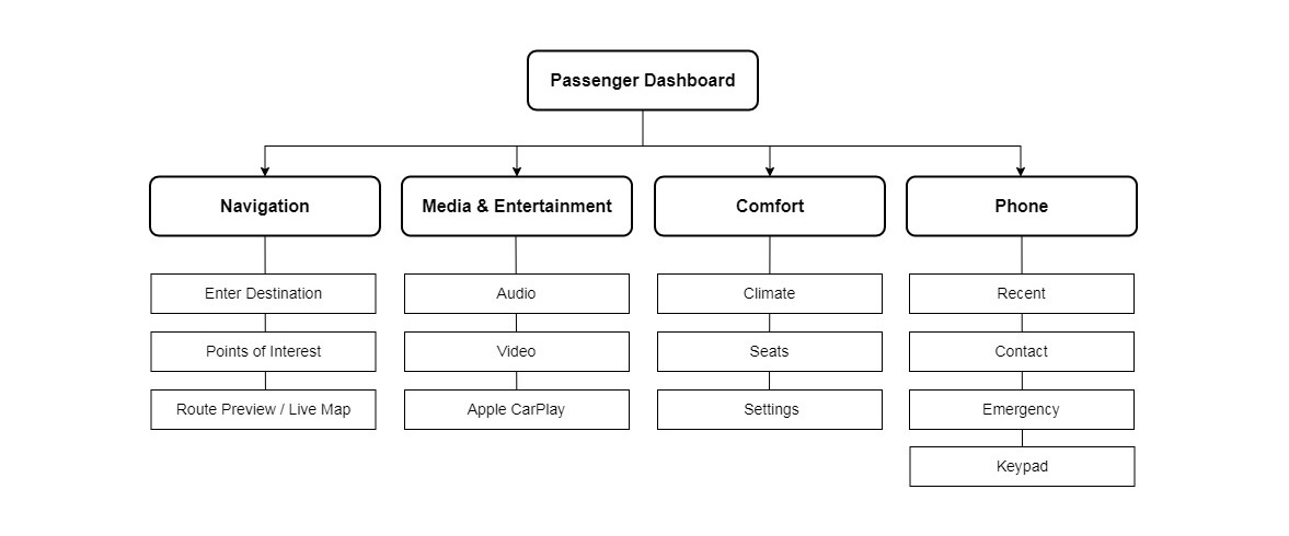 The passenger dashboard is positioned in front of the passenger; it is not shared via the center stack. The passenger is treated as a co-pilot, not a secondary driver tool. The passenger dashboard offers control over comfort, media, and even ambient settings, with no need to reach over or share the central space.