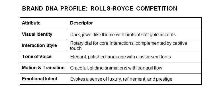 Before presenting the final UI screens, it’s essential to highlight how the Rolls-Royce brand DNA guided each design decision. In a vehicle defined by refinement, elegance, and effortlessness, the digital experience must feel just as luxurious as the materials surrounding it.