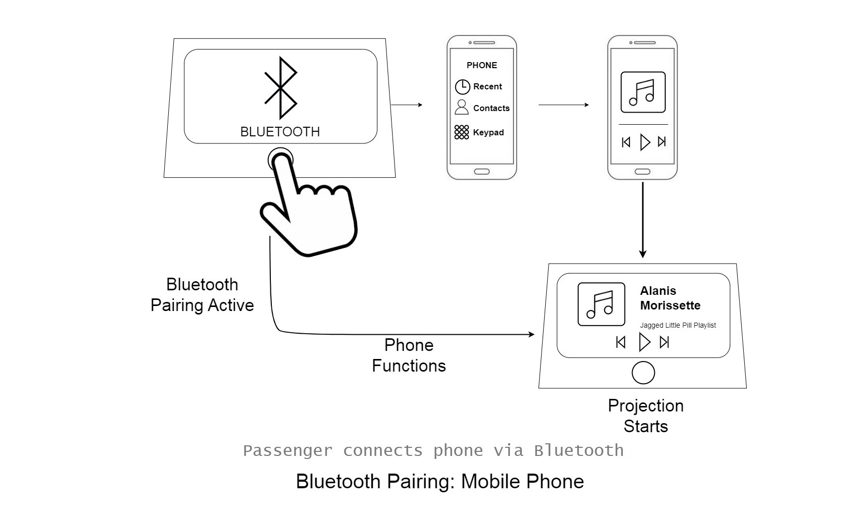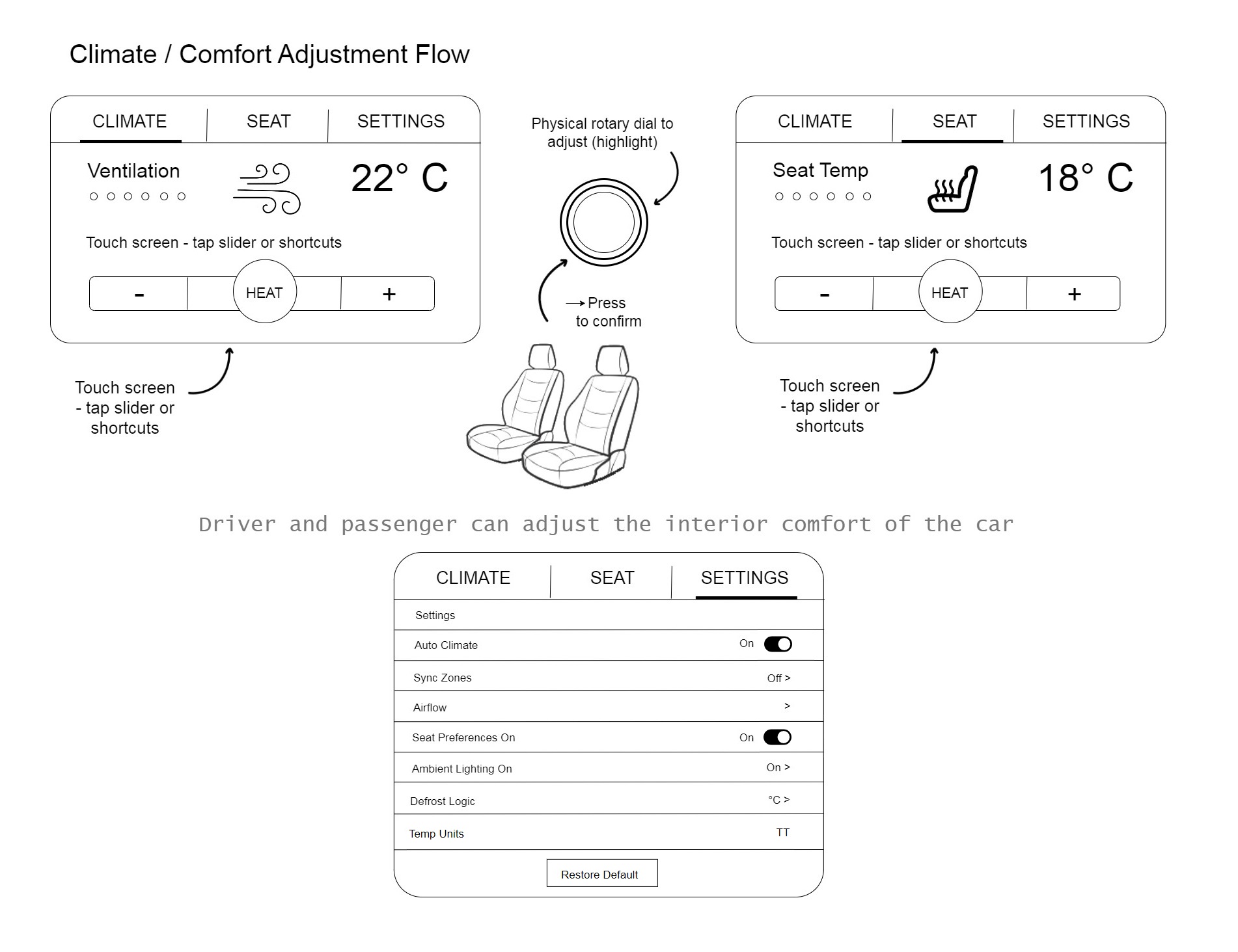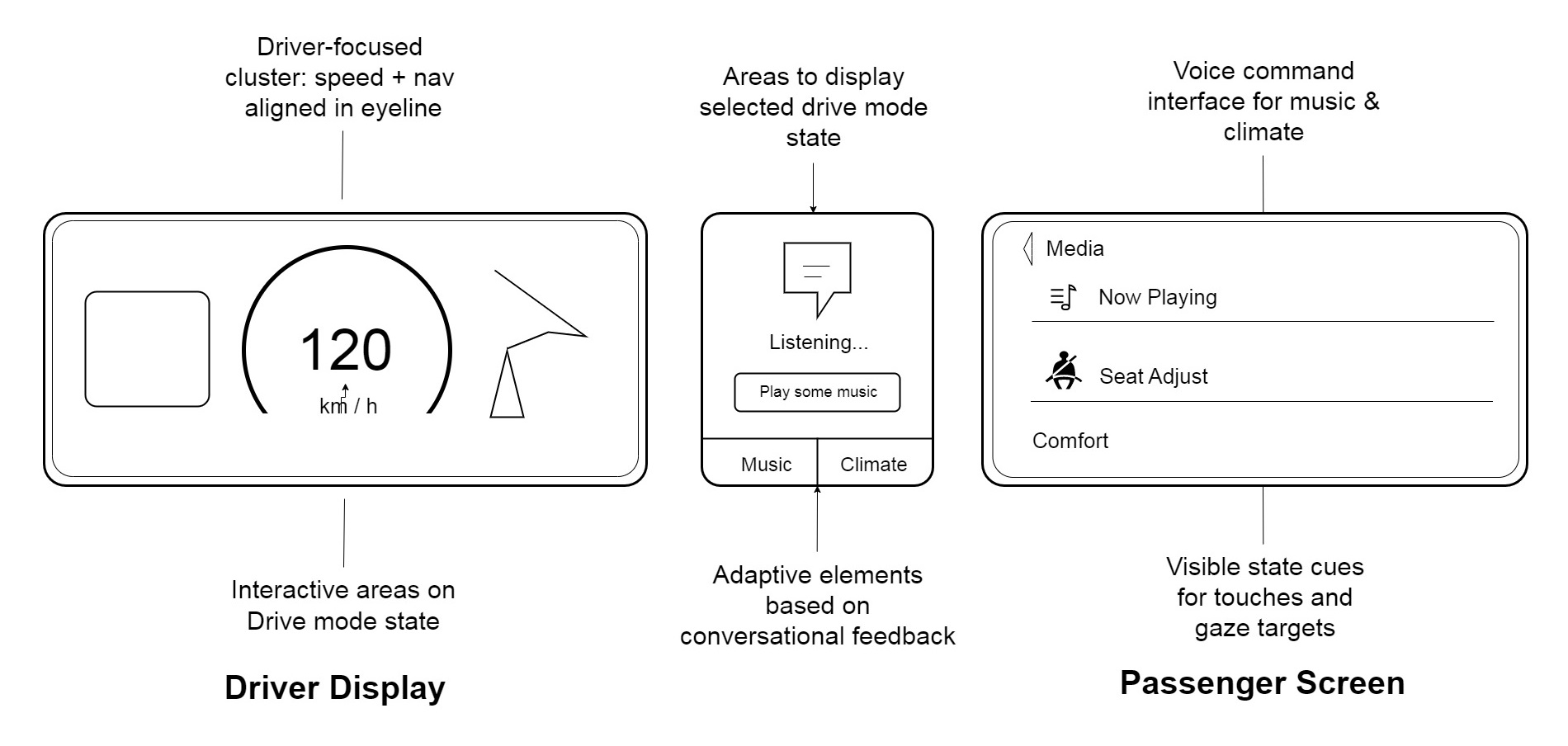 These sketches illustrate key user flows within the infotainment system, demonstrating how seamless interactions are achieved across both driver and passenger touchpoints.