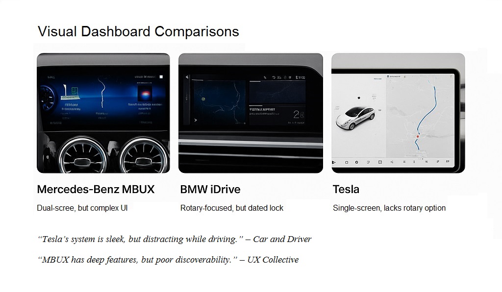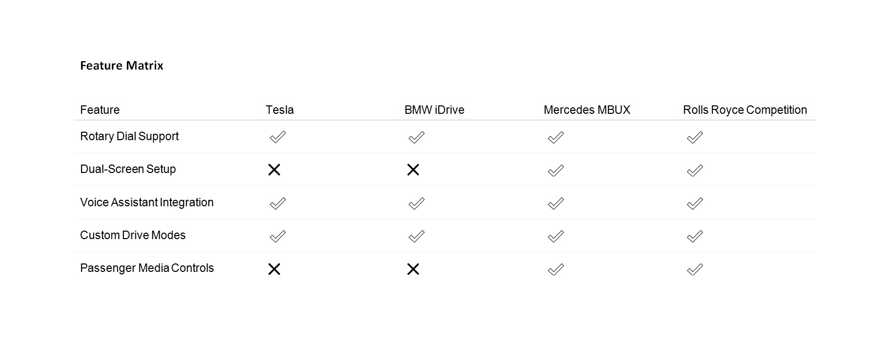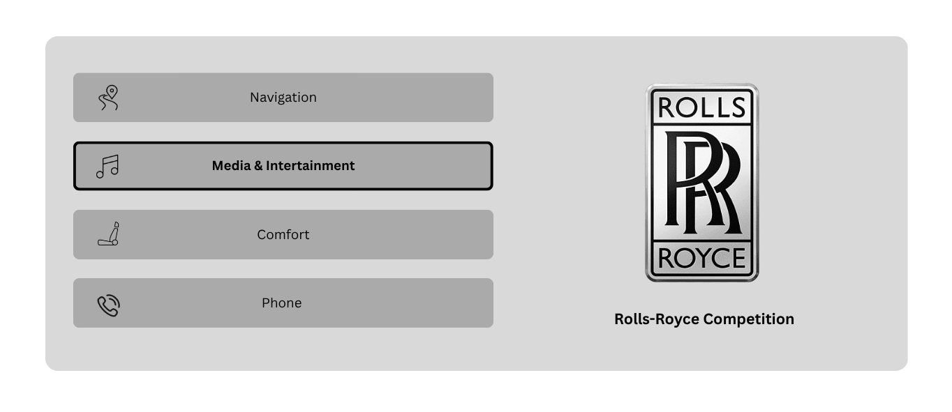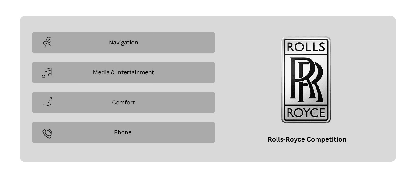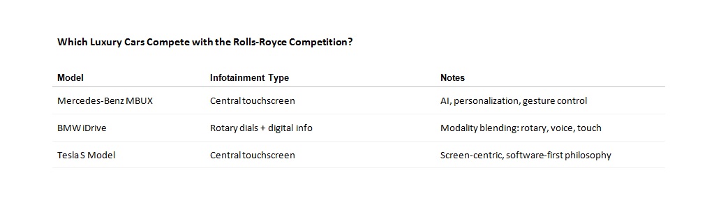 The Rolls-Royce Competition model is UX-heavy, comfort-centric, and digital. You can benchmark it against infotainment leaders like Mercedes-Benz, BMW and Tesla.
