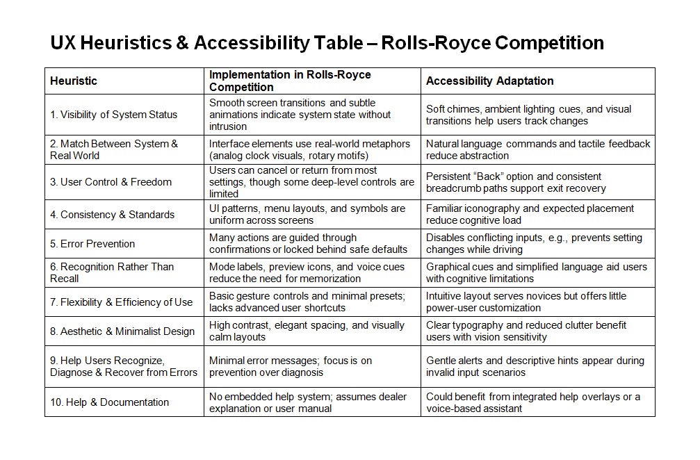 The infotainment system of the Rolls-Royce Competition was evaluated against Jakob Nielsen’s 10 usability heuristics to assess its user experience performance. True to the brand’s legacy, the system emphasizes elegance, predictability, and minimal cognitive load, offering a calm, curated experience for discerning luxury drivers.