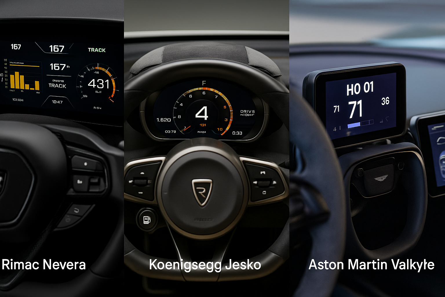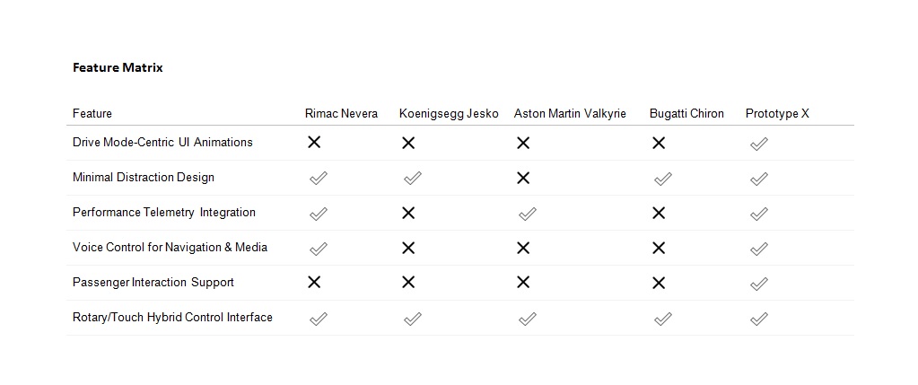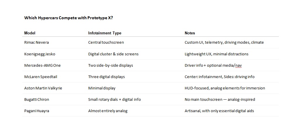 Given the futuristic design, dual-role central console, and sci-fi inspiration of Prototype X, the most comparable hypercars are: Aston Martin Valkyrie, Mercedes-AMG One, Koenigsegg Jesko, McLaren P1 GTR, Rimac Nevera, Bugatti Chiron, Ferrari SF90 Stradale, and Pagani Huayra.