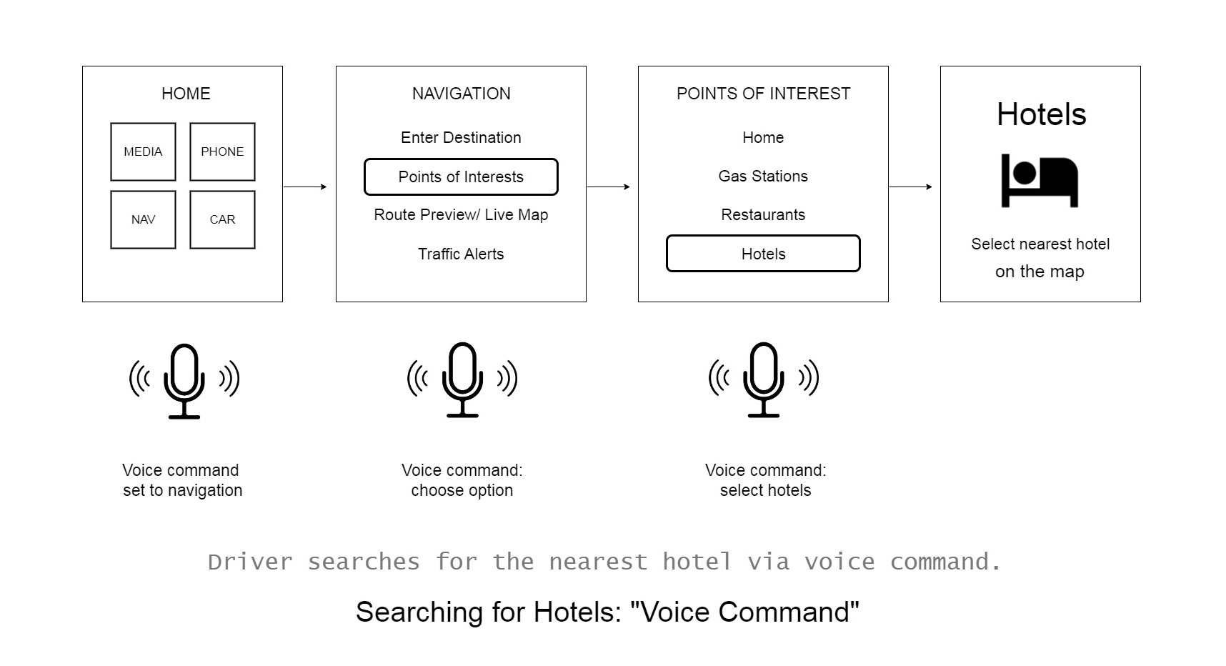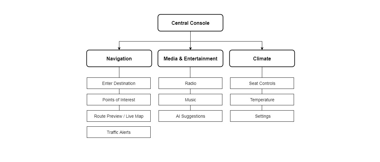 These sketches illustrate key user flows within the infotainment system, demonstrating how seamless interactions are achieved across both driver and passenger touchpoints.