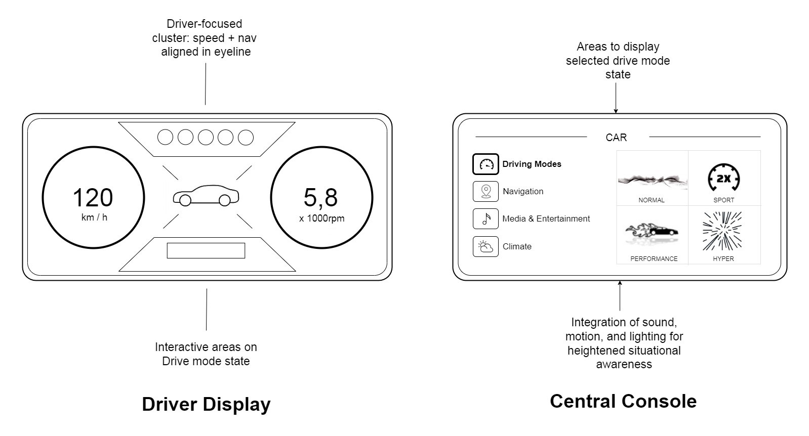 When switching between Drive, Sport, or Hyper Mode, the screen can animate dramatically, almost like a cinematic “sequence” (pulsing circuits, glowing engine cores, digital morphing, etc.). In Sport and Hyper Mode drives, the console is reduced to minimal distraction with less menus, less interactions, for more tactile and visual clarity. With this console I’m imagining a future where digital interfaces are sculptural and sensory, not merely utilitarian.