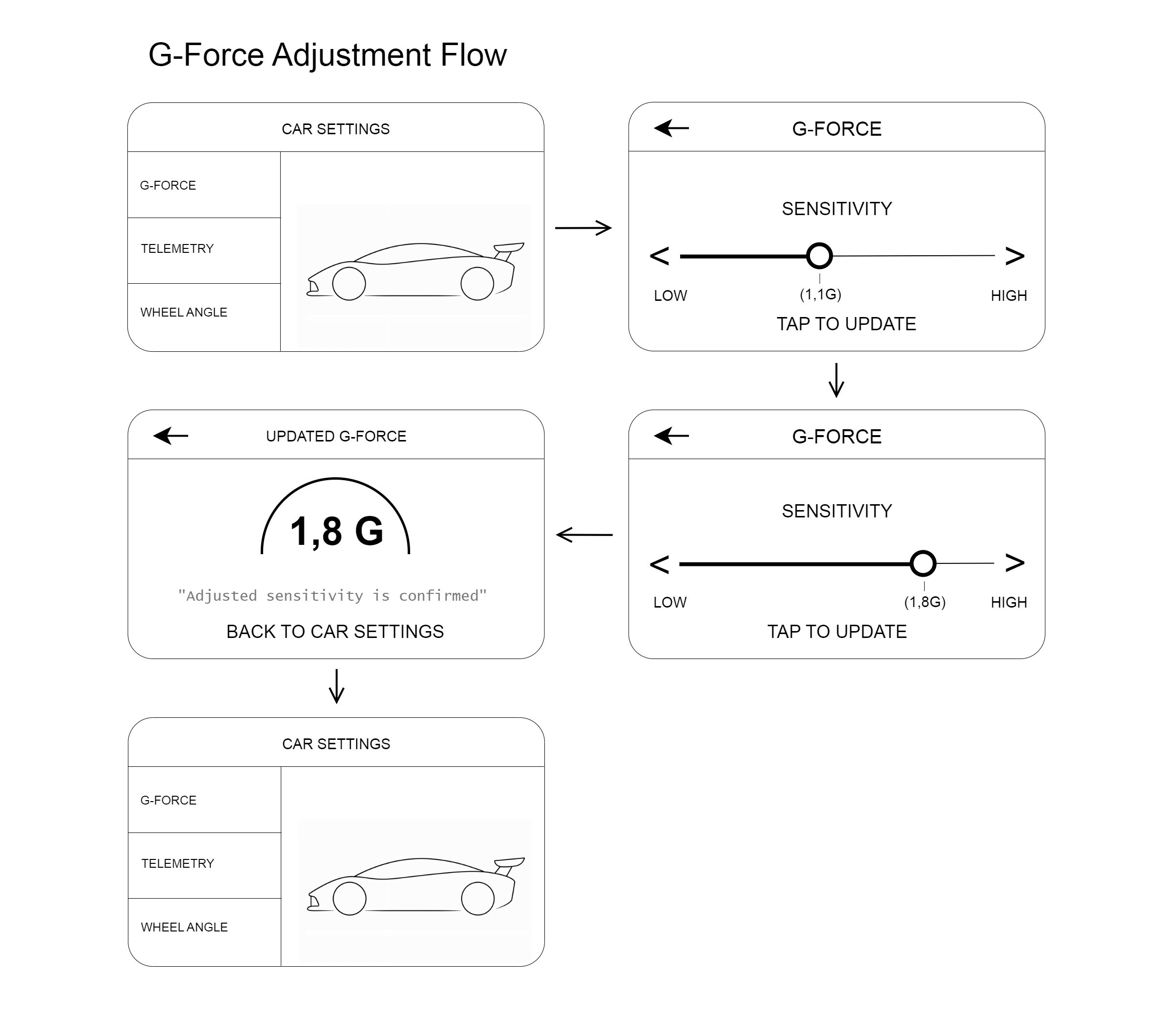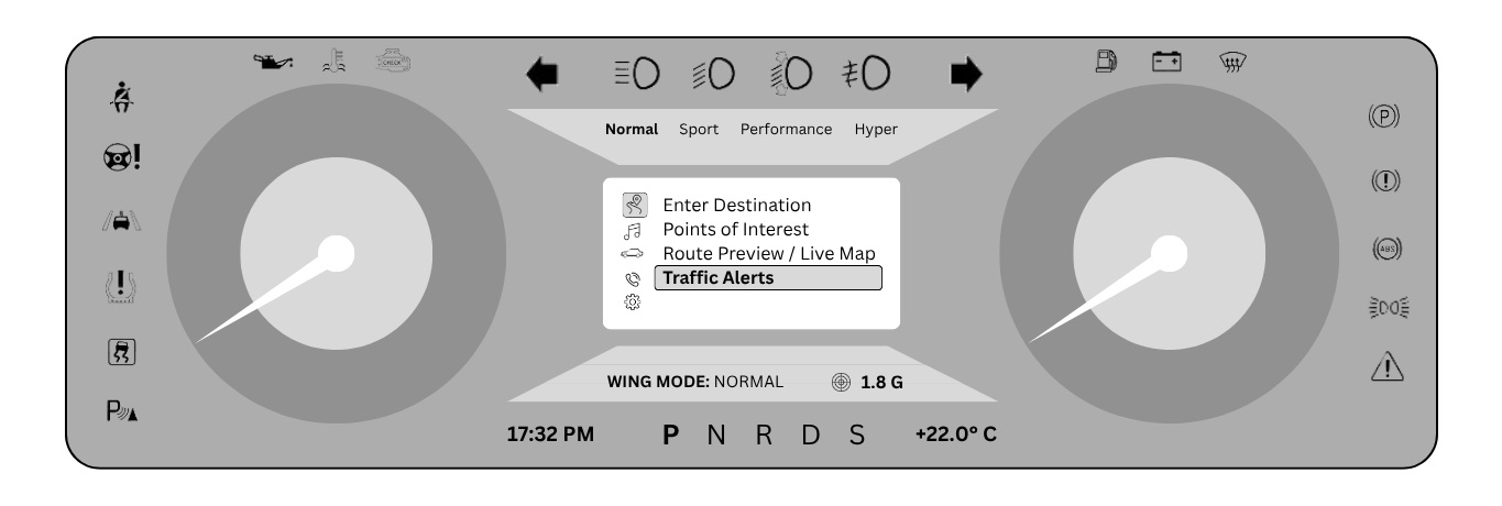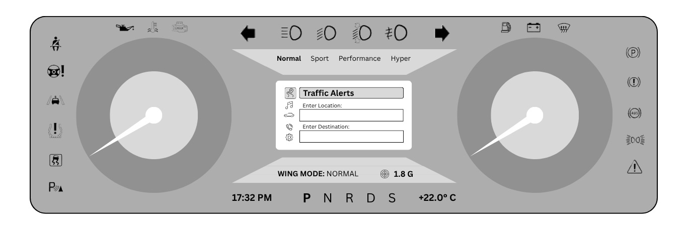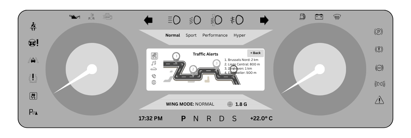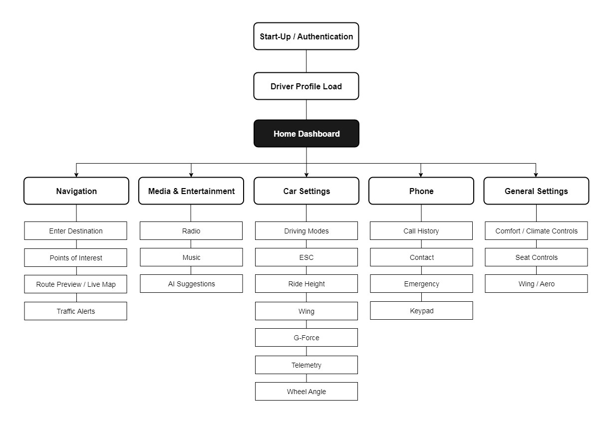 Every touchpoint is designed to serve high-speed decision-making with cinematic clarity and immersive control, while still maintaining visual elegance and intuitive flow. The system blends track-grade telemetry with a dynamic UI that adapts to driver input and environment.