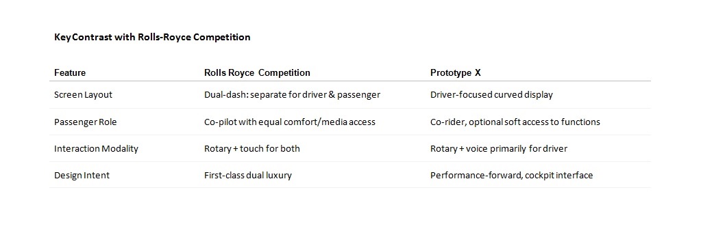 Unlike the Rolls-Royce Competition’s dual-dashboard model, Prototype X centralizes control, placing the driver at the helm of all interaction. The passenger is a welcomed co-rider, with limited but intuitive access to comfort or media via soft handoff modes or ambient gestures.