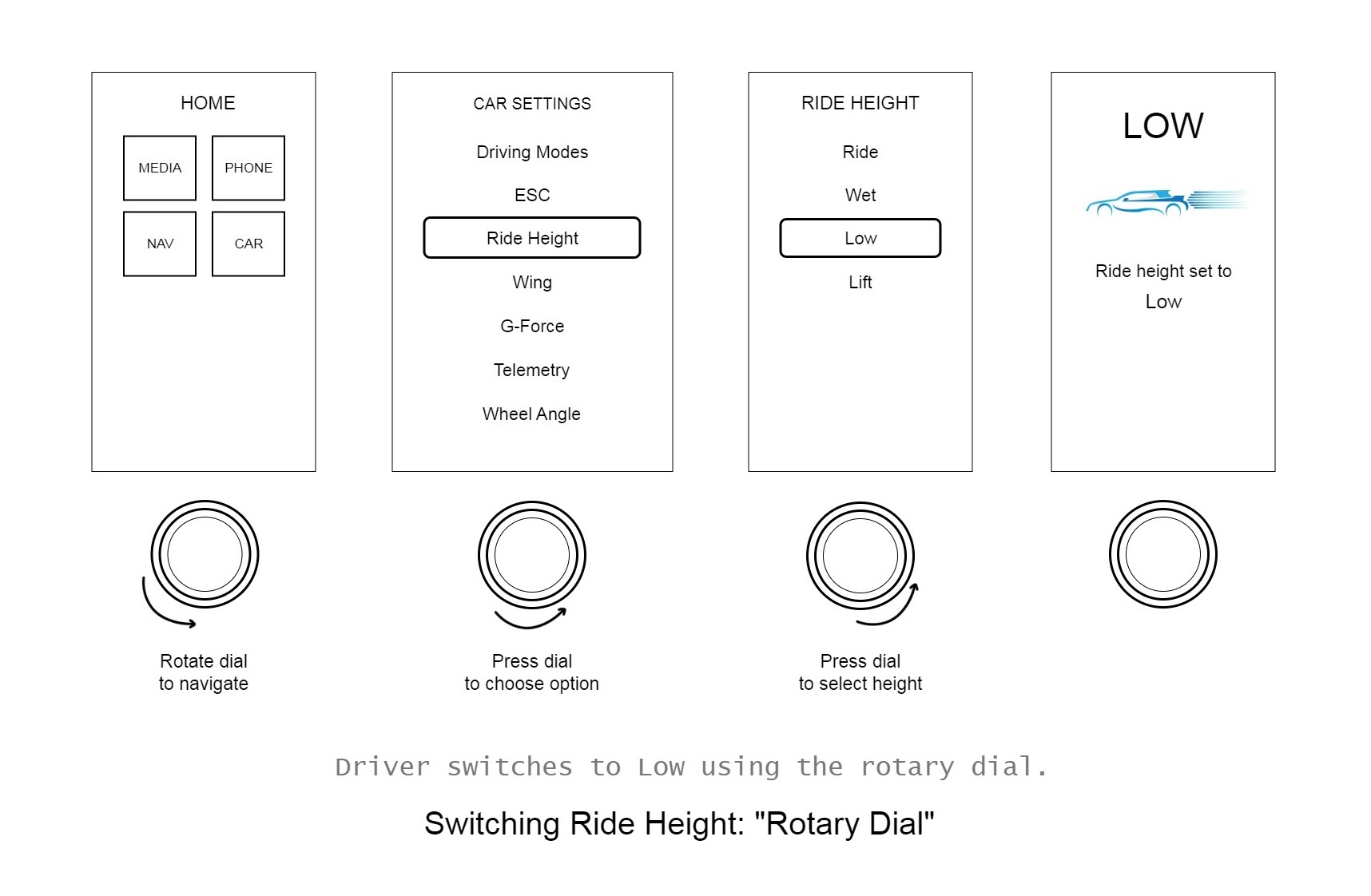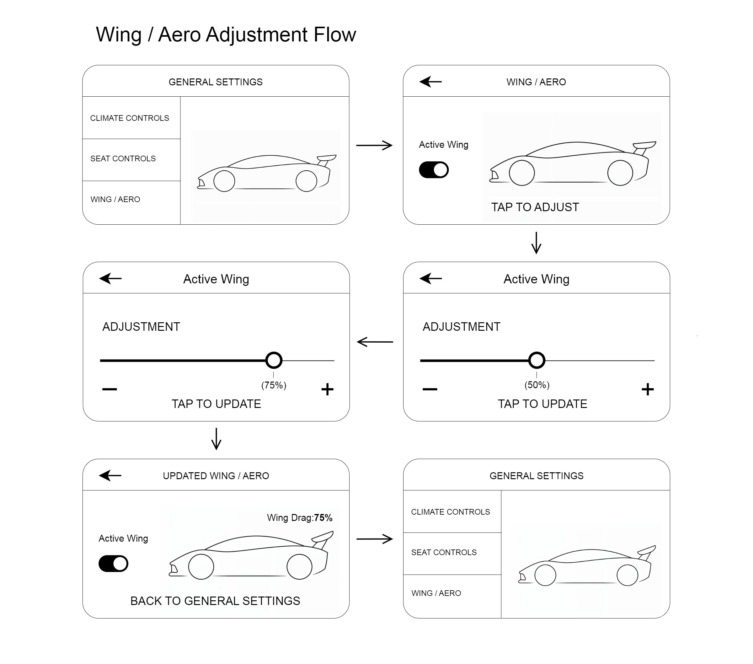 Designed around fluid gesture control, visual clarity, and contextual responsiveness, the interface enables users to seamlessly navigate between features like music, climate, and driving modes with minimal friction. These annotated flows and microinteractions reflect real-world usage priorities — quick access, smooth transitions, and constant system feedback — ensuring the experience remains both elegant and driver-safe.