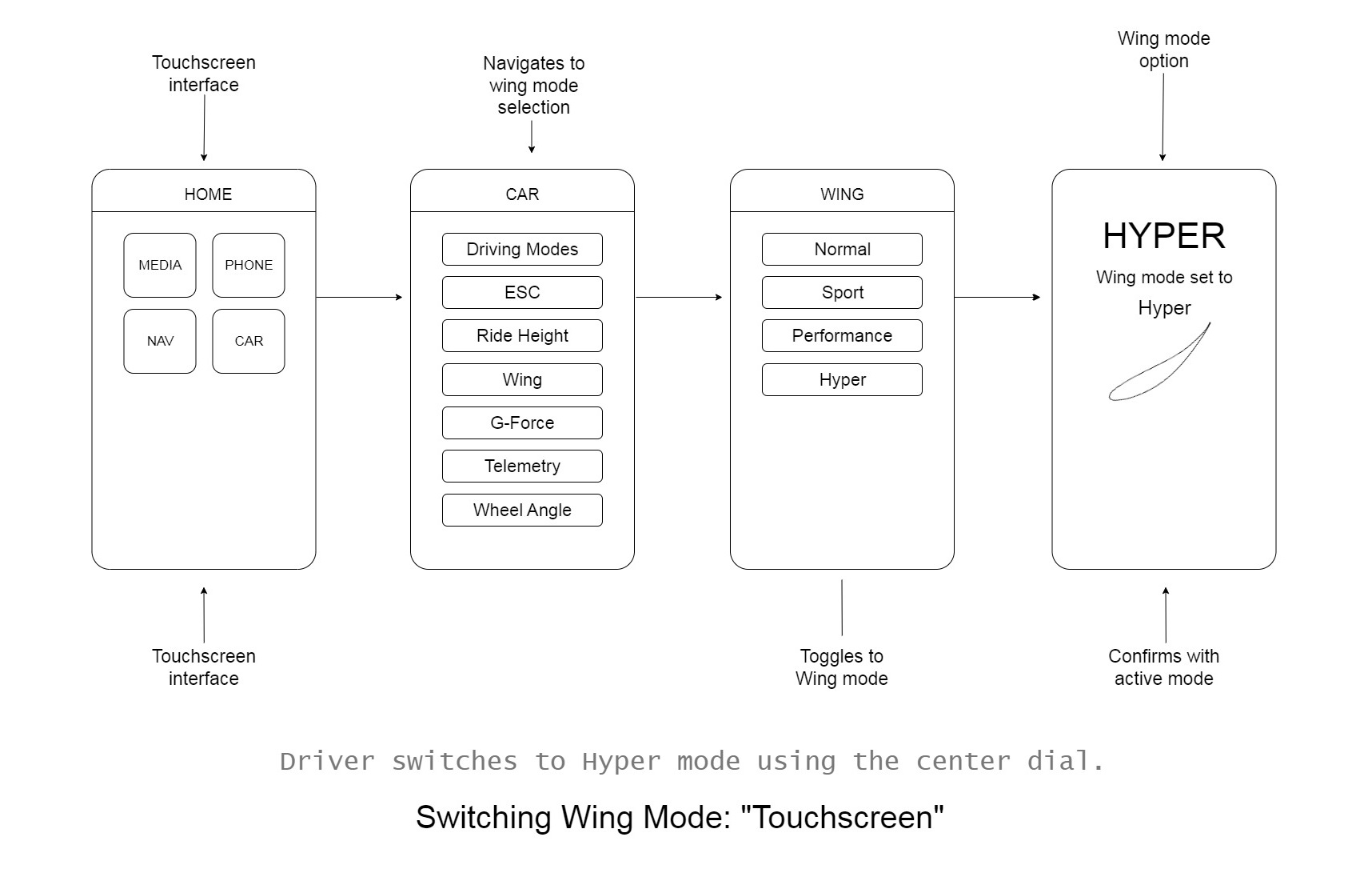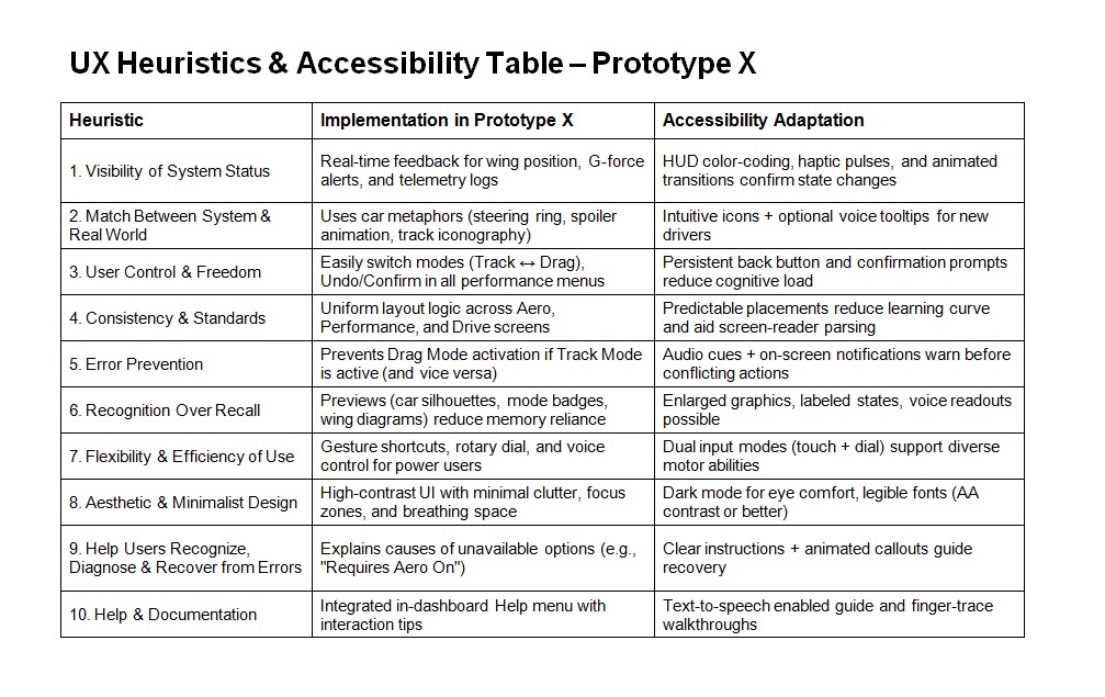 The infotainment system of Prototype X is built not only for speed, but for clarity, control, and inclusivity. Every microinteraction — from adjusting the active wing to navigating G-force telemetry — was crafted using Jakob Nielsen’s 10 usability heuristics, adapted to the unique demands of high-performance driving.