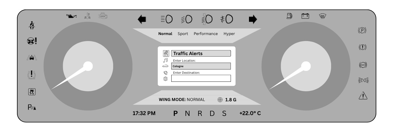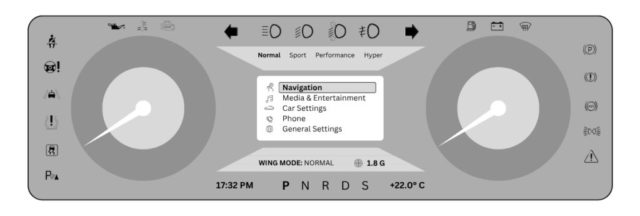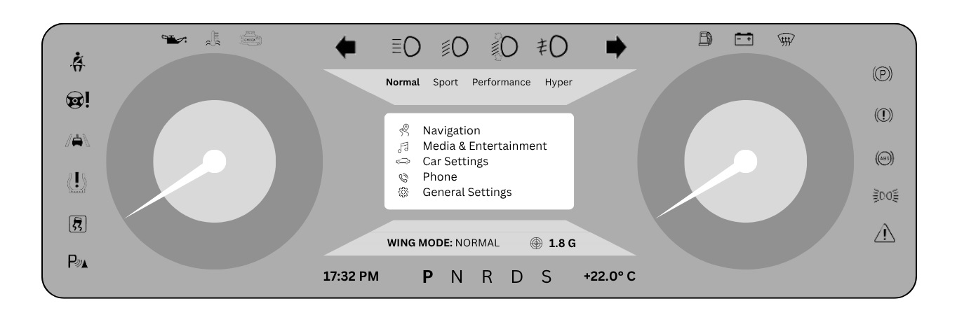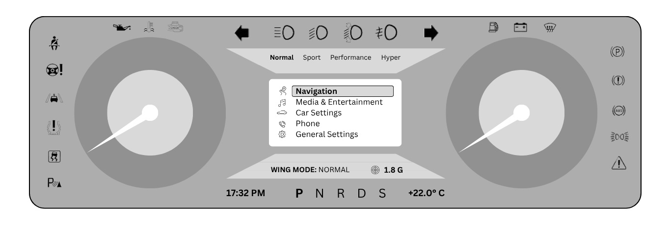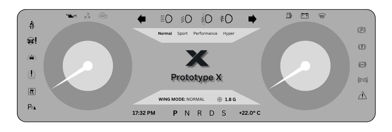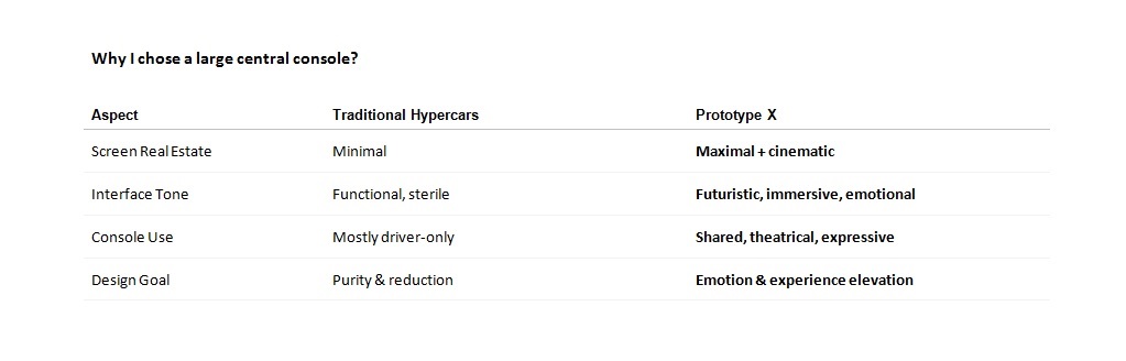 In hypercars, driver-centrism is not just a design trend; it’s a philosophy rooted in performance, control, and emotional experience. The driver is the primary user despite the wide features of Prototype X, especially in a high-performance environment. At top speeds the Interface of the console is reduced to minimal distraction with less menus, less interactions, for more tactile and visual clarity.