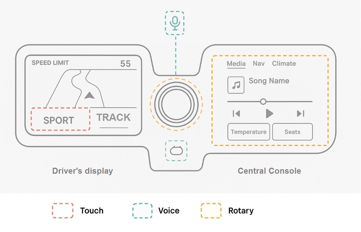 Designed for fast-paced decision-making, the system integrates navigation, performance metrics, and media into one fluid layer. The rotary dial becomes an extension of the hand, while voice prompts for the driver offer access to core actions, minimizing visual load and maximizing driving presence.