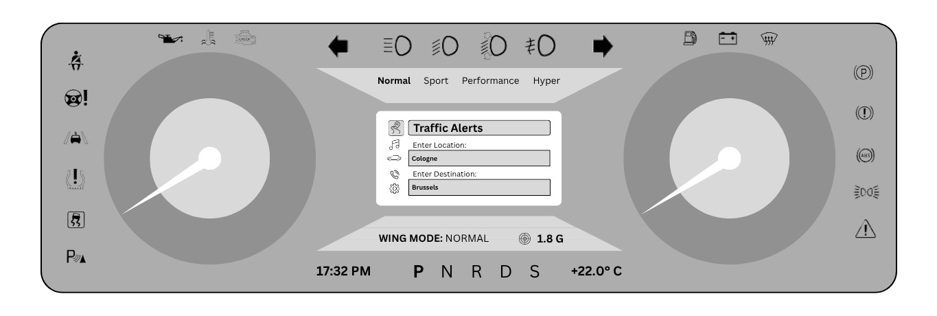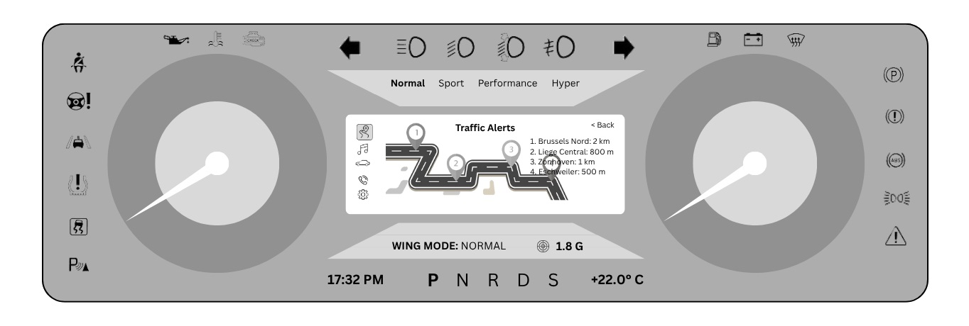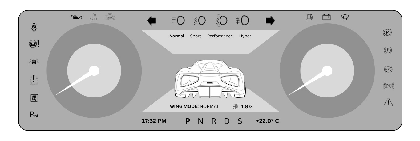 This prototype represents a vision of a futuristic, high-performance vehicle, where every interaction reflects precision, control, and cutting-edge intelligence. In this context, the digital experience plays a crucial role in reinforcing the car’s personality — bold, responsive, and intuitive.