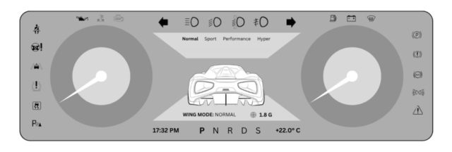 The driver’s dashboard consists of a flat large screen for sports cars with 2 essential gauges that allows you to display a multitude of information on many screens. Information about the rear spoiler, the G-force for top speeds, the height of the car, as well as telemetry data are available from there.